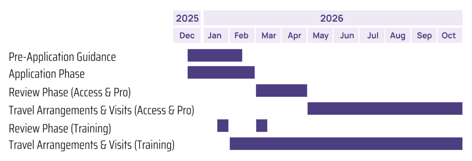 Pre-application guidance for Access and Pro Grants will be offered until mid-February and will not be available up to the application submission deadline of 28 February. This is because preparing an application for this call requires time, from identifying and contacting a host institution, to discussing and refining plans, and completing the application. Applicants are therefore advised to plan accordingly if they wish to receive pre-application guidance, and to begin planning their application well before the deadline.